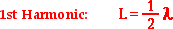 In comparing the standing wave pattern for the first harmonic with its single loop to the diagram of a complete wave, it is evident that there is only one-half of a wave stretching across the length of the string. That is, the length of the string is equal to one-half the length of a wave. Put in the form of an equation: