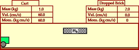 The animation below portrays the collision between a 1.0-kg cart and a 2-kg dropped brick. It will be assumed that there are no net external forces acting upon the two objects involved in the collision. The only net force acting upon the two objects (the cart and the dropped brick) are internal forces - the force of friction between the cart and the dropped brick. The before- and after-collision velocities and momentum are shown in the data tables.